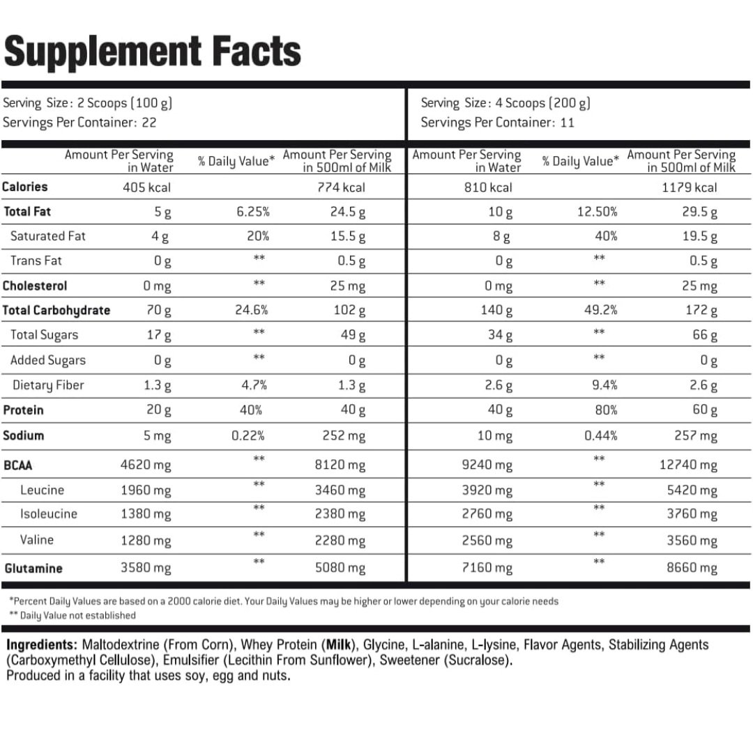 Rest day: Mix two scoops (100g) with 400-600ml (13.5-20oz) of milk or water between meals. Blend the mixture 60 to 120 seconds before use. For additional calories, add whole milk and other foods such as peanut butter, oatmeal, and fruits.