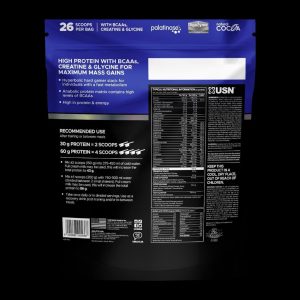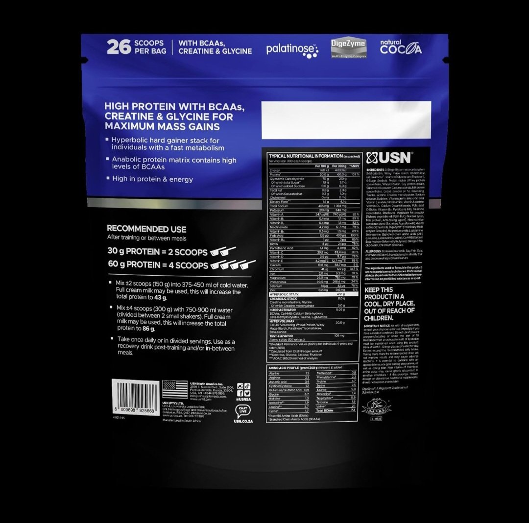 51g protein per serving. 13 scoops. Resealable zipper pack. 29.5g hyperbolic stack. USN®. Hardcore. 51g high quality protein. 13 scoops per bag. All-in-one hyperbolic mass. All-in-one muscle gainer. High levels of intrinsic BCAAs and glutamine. Hyperbolic muscle mass catalyst for the hard gainer. Tolerase™ L. 31, daily. Strength. Mass. Recovery.