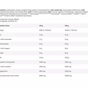 Hyperbolic muscle mass catalyst for the hard gainer: Power enhancing BCAAs. Premium quality protein. Enhanced energy levels. Benefits: 51g anabolic protein matrix per serving. Advanced amino acid delivery formula. 29.5g hyperbolic stack per serving to optimise muscle growth. 6300mg glycine. 1000mg taurine. 4.5g creatine increases physical performance in successive bursts of short-term, high intensity exercise. High in BCAAs and glutamine. Protein is necessary for tissue building and repair, and it contributes to the maintenance of muscle mass. Calcium is necessary for normal nerve and muscle function, and is needed for muscular growth and contraction. Magnesium contributes to normal protein synthesis. Calcium and magnesium contribute to normal energy-yielding metabolism. Vitamin B6 contributes to normal protein and glycogen metabolism. Iron contributes to normal oxygen transport in the body