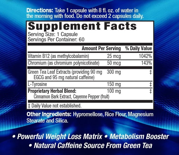 Caffeine & Green Tea – Boosts Energy & Mood, Cayenne Pepper – Powerfully Raises Metabolism, Cinnamon Bark Extract – Supports Blood Glucose Control, Vitamin B12 – Helps Keep The Body’s Nerve and Blood Cells Healthy, Chromium Polynicotinate – Enhance Protein, Carbohydrate, & Lipid Metabolism