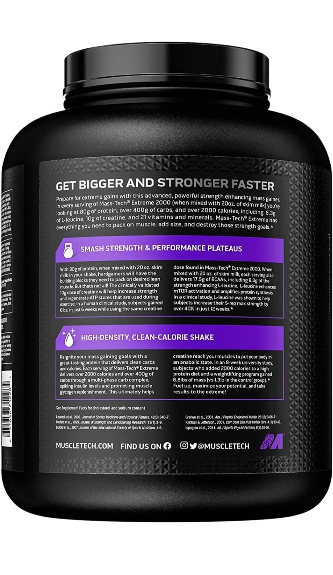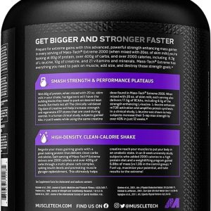 Each serving of MASS-TECH EXTREME 2000 (when mixed with 600 ml of skim milk) delivers 17.8g of BCAAs, including 8.2g of musclebuilding L-leucine L-leucine supports amplified protein synthesis, which results in muscle gains. Moreover, it contains a clinically validated 10g dose of creatine to help increase strength and regenerate ATP stores that are reduced during resistance training.