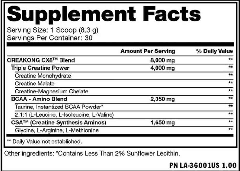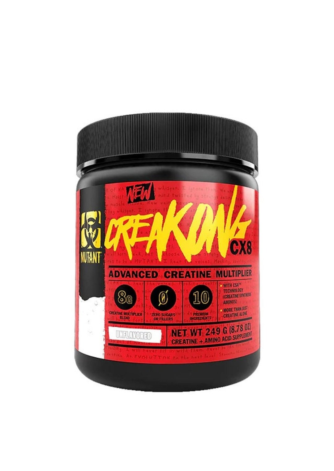 MUTANT CREAKONG CX8 is an advanced creatine formula made with three of the best forms of creatine commercially available. Each creatine source is lab tested and supported by actual human studies showing increases in lean mass, strength, power, and recovery.
