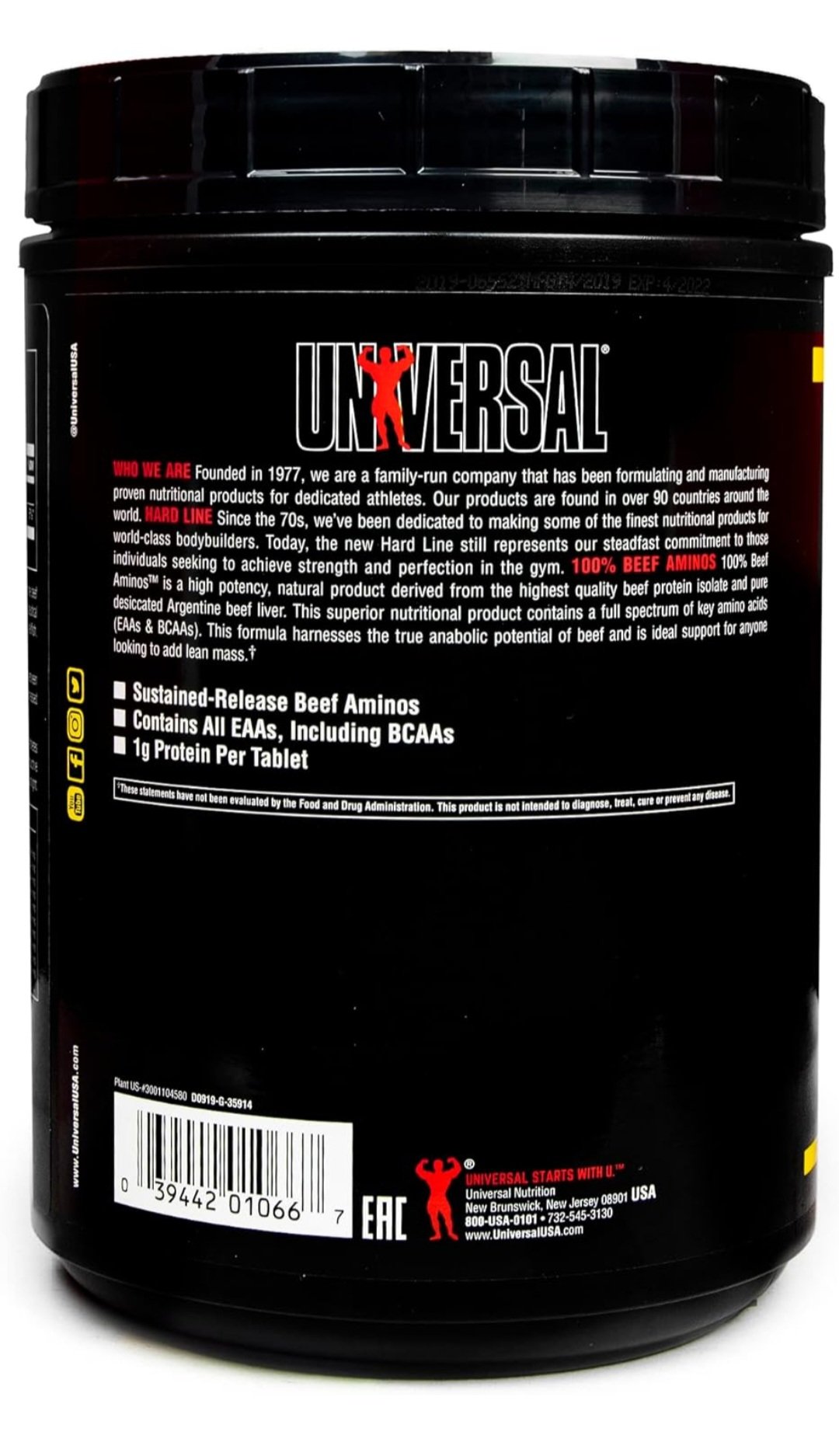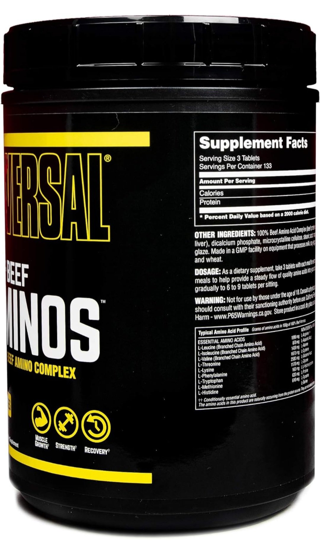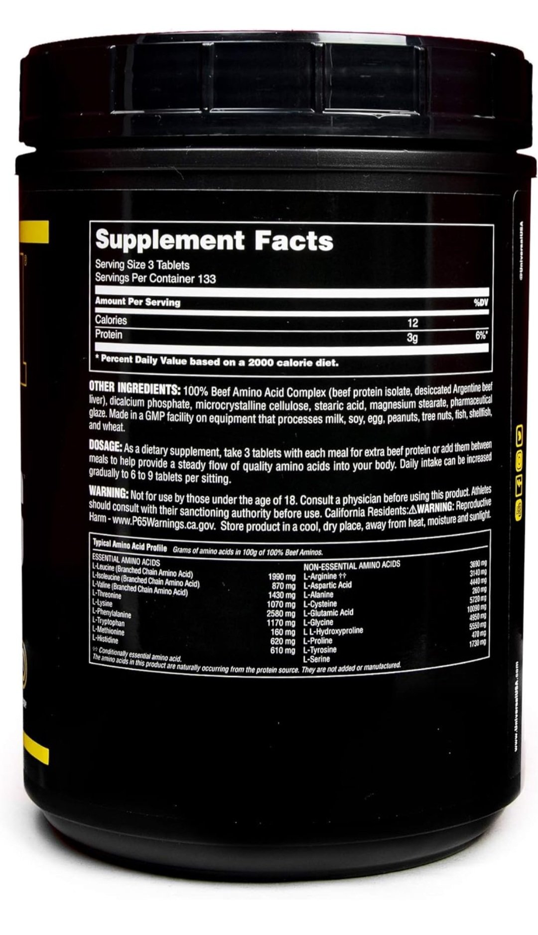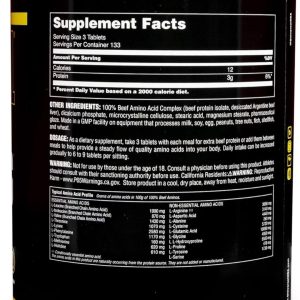 100¾efAminoAcidComplex(beefproteinisolate,beefalbuminconcentrate,dessicatedArgentinebeefliver),dicalciumphosphate,microcrystallinecellulose,stericacid,magnesiumstearate,sunflowerlecithin,pharmaceuticalglaze.